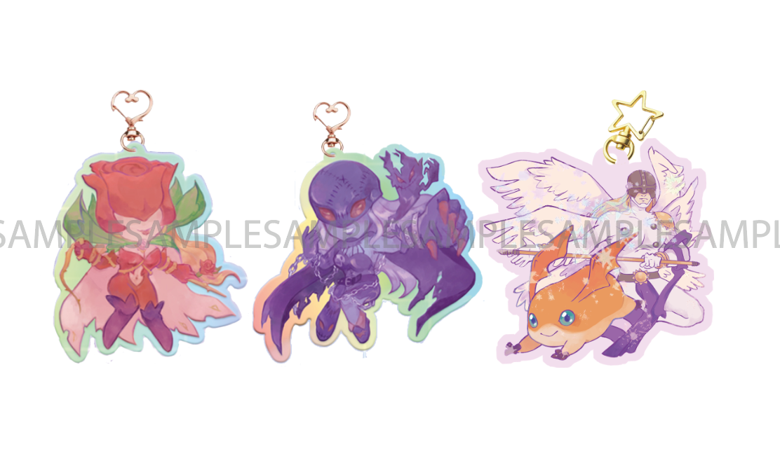 Rosemon and Ladydevimon: epoxy coating, rainbow effect Angemon: no epoxy coating, sparkly effect 'r