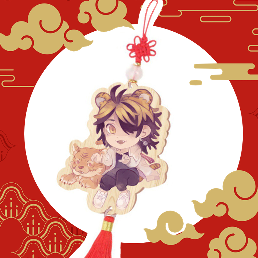Wood charm featuring Kazutora from Tokyo Revengers. Charm is 6.5cm or 2.5", includes Chinese knot beads accessory.